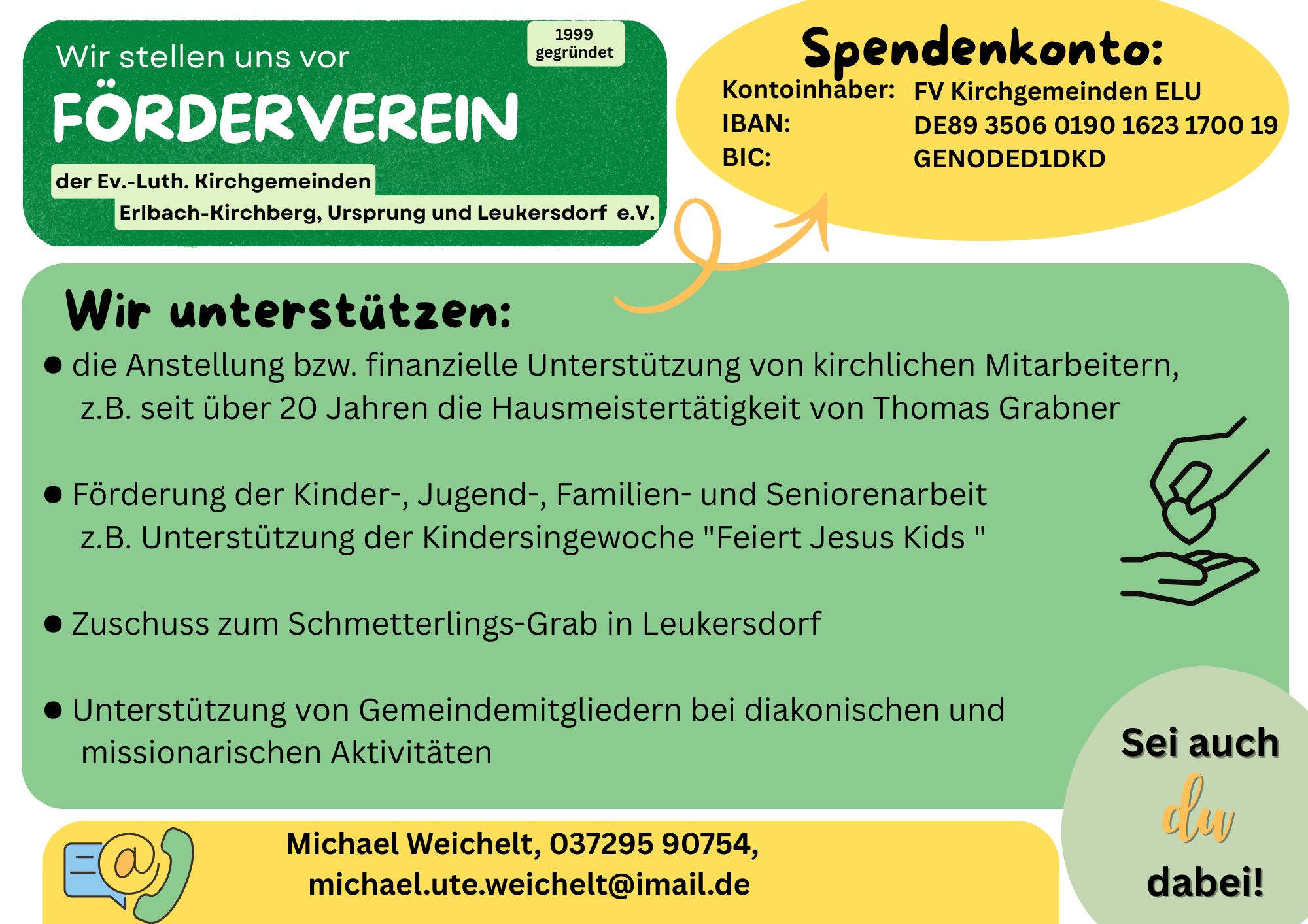 Falls Sie weitere Informationen über den Förderverein haben wollen, so wenden Sie sich bitte an den Förderverein der Ev.-Luth. Kirchgemeinden Erlbach-Kirchberg, Ursprung und Leukersdorf e.V., z.Hd. Vorstandschaft, Pfarrweg 3, 09385 Lugau / OT Erlbach-Kirchberg.